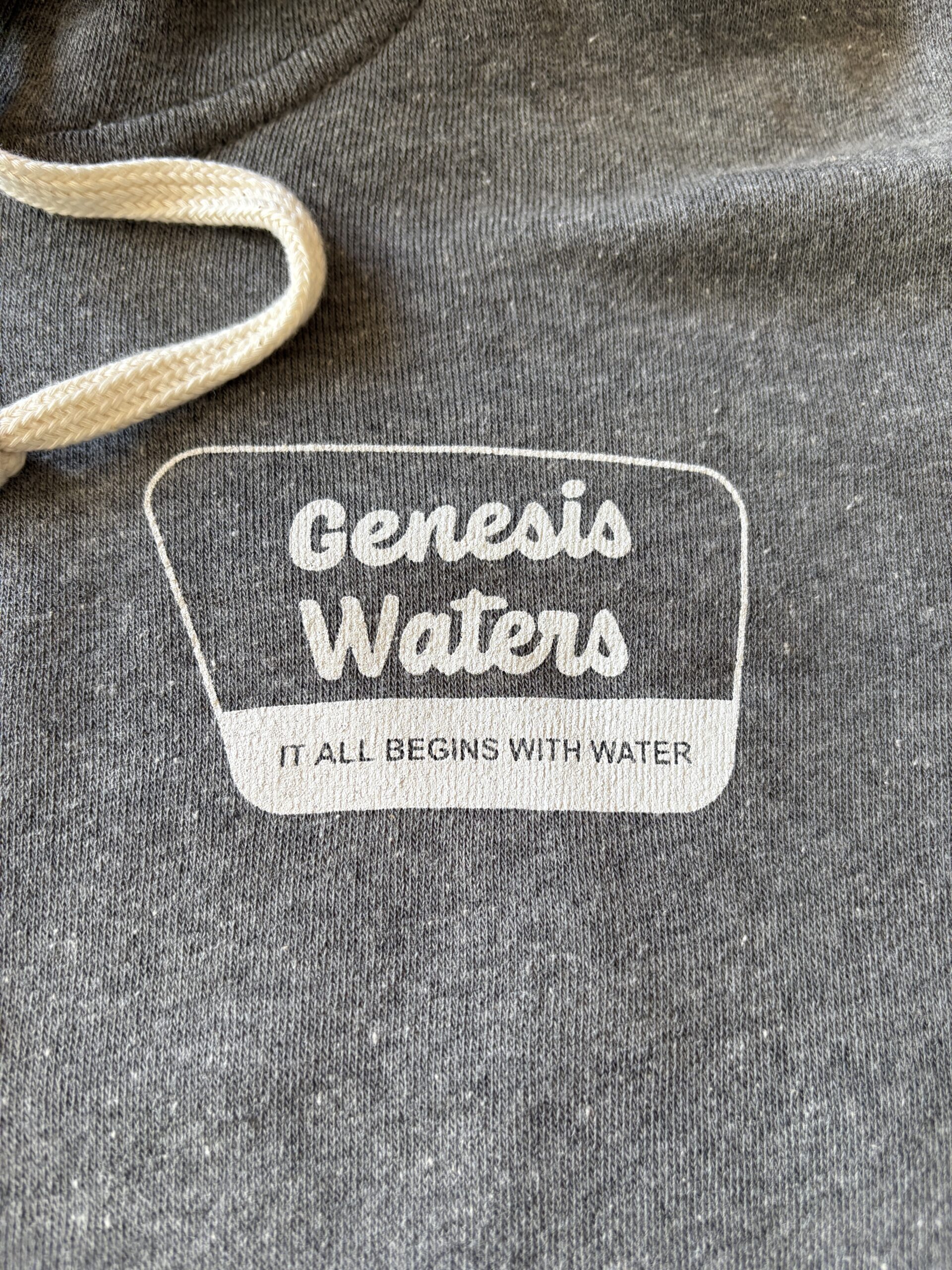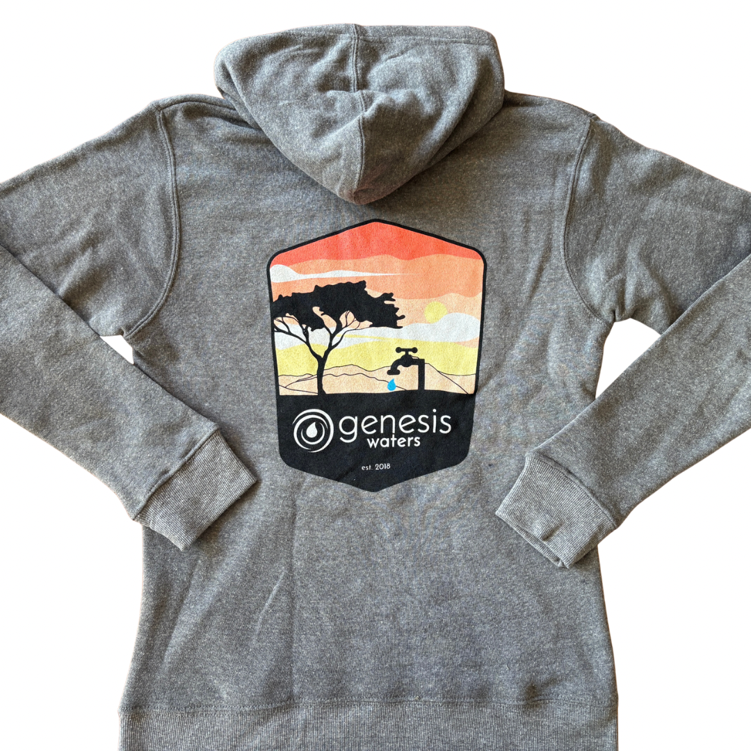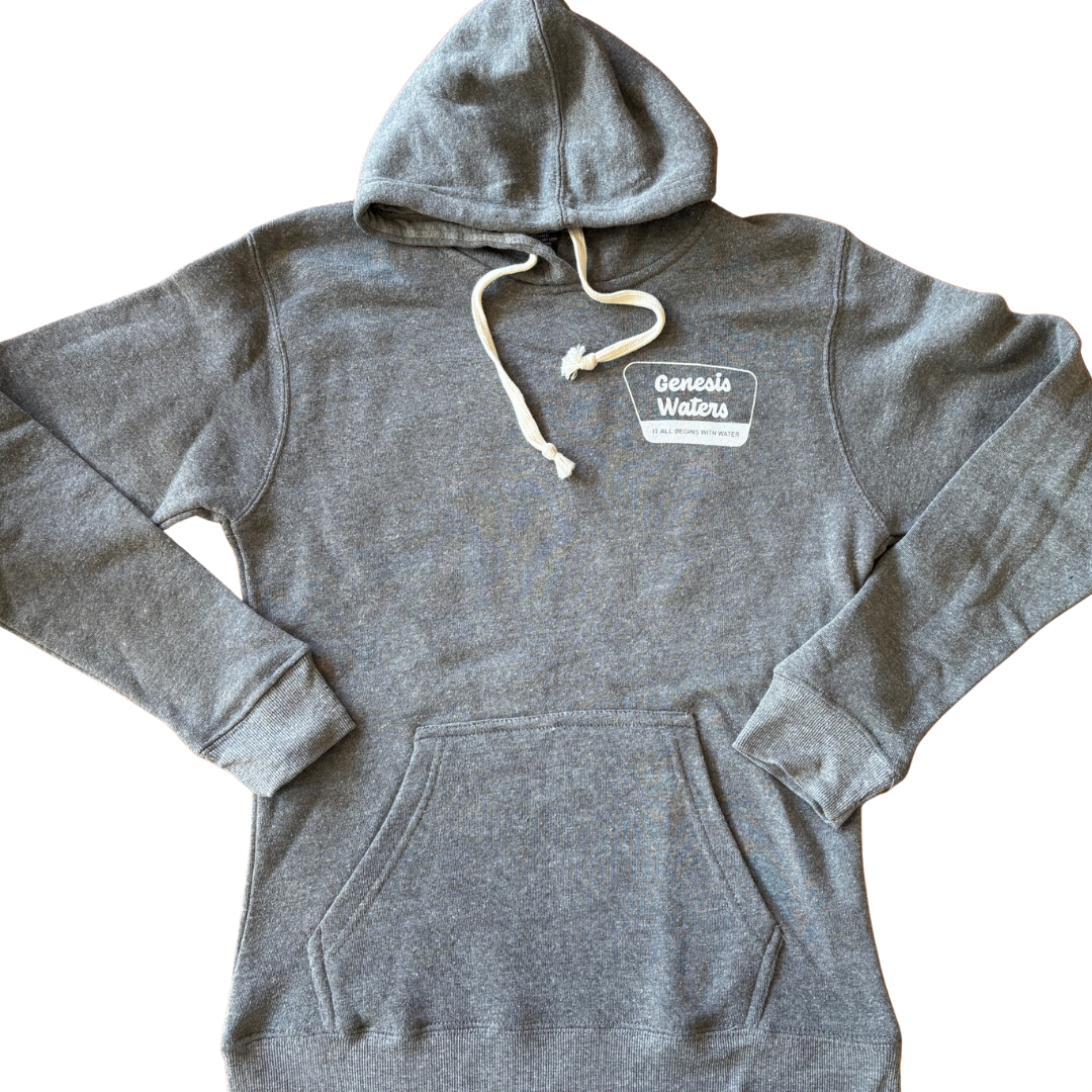 Smoke gray J. America tri-blend super soft fleece featuring a hood, off-white drawstrings and front pouch pocket. The hooded style features Genesis Waters on the front and a National Parks meets Africa design on the back. Also available in teal.